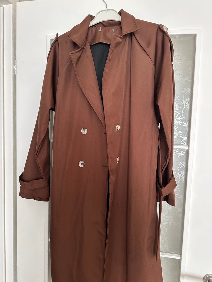 Kadınlar için uzun, kahverengi düğmeli trençkot. Rahat kesim, uzun kollu ve kesik yaka detayına sahip. Günlük sokak stiline uygun, Paris esintili şık parça. Hiç Giyilmemiştir