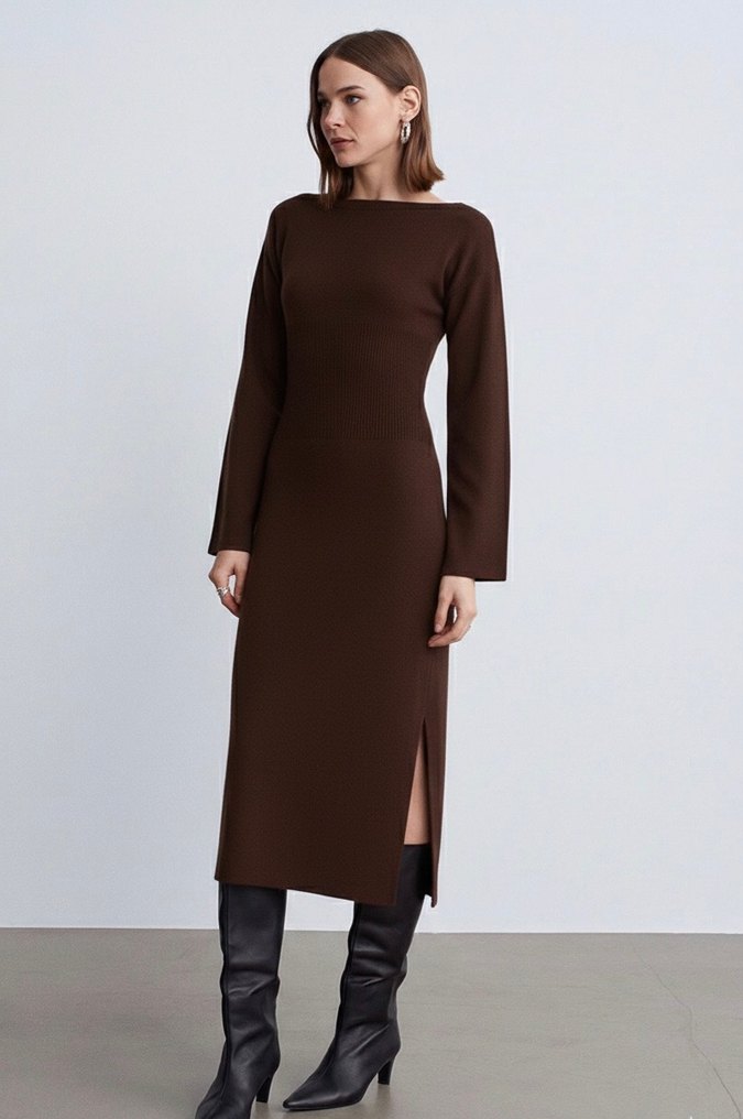 Kahverengi, uzun kollu, tek renkli, minimalist tarzda, tek parça, tek renk, ofis için uygun, rahat kesim, tek parça elbise.