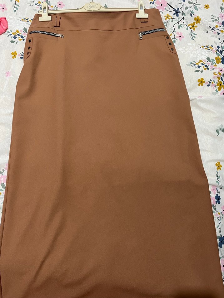 Düz kahverengi, sentetik kumaştan yapılmış, normal kesim ve fermuarlı cepleri olan uzun etek. Ofis ve günlük şehir tarzı için uygundur.