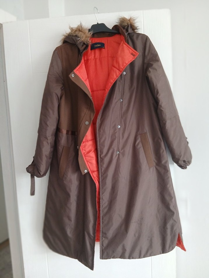 Kadın kahverengi uzun fermuarlı ceket, çıtçıtlı cepler ve kürk detaylı kapüşon içerir. Yumuşak ve sıcak kumaştan, bol kesim ve uzun kolludur. Günlük kullanıma uygundur. kapüşon fermuarlı istenildiğinde çıkarılabilir hiçbir sorunu yok beden 46 fakat dar kalıp 42/44 bedene uygun