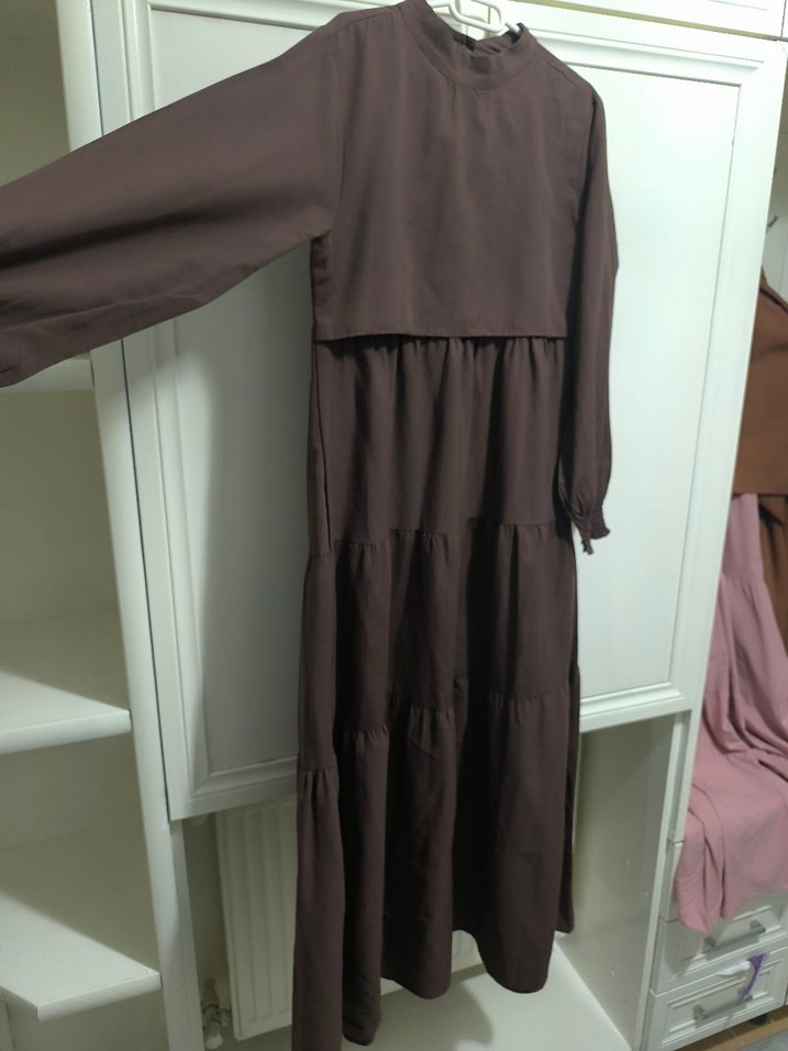 Yüksek yakalı, uzun kollu ve bol kesimli kadın kahverengi keten uzun elbise. Drapeli tasarımıyla sade ve günlük kullanıma uygun. bolero görünümlü az kullanıldı yeni gibi renkleri var marka temsili 42 44 bedene olur koltuk altı 50 cm tek taraflı ölçümü boyları tam boy