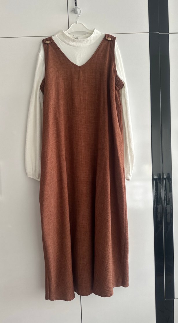 Bol kesim, kahverengi uzun keten elbise, askısız yaka ve drapeli tasarıma sahip, bohem tarzını yansıtıyor. Günlük kullanım için uygundur.