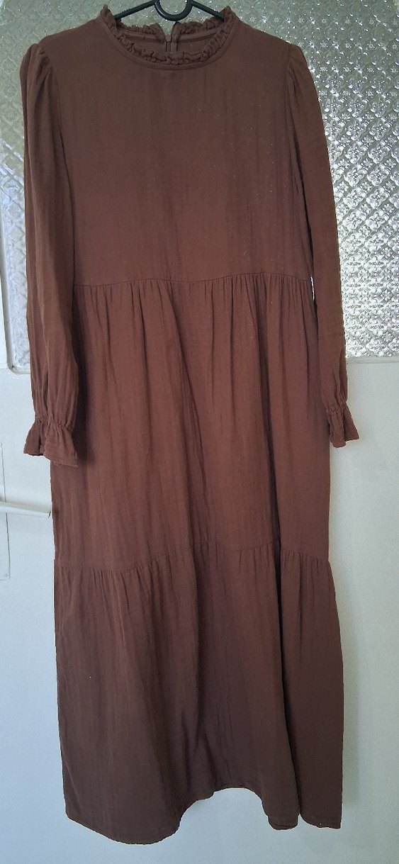 Kadınlar için uzun, bol kesim keten elbise. Uzun kollu, fırfırlı ve düz koyu kahverengi renkte, bohem tarzda. Sadece 1 kez kullanıldı. Kumaşı müslindir. Hamile olduğum için satıyorum.