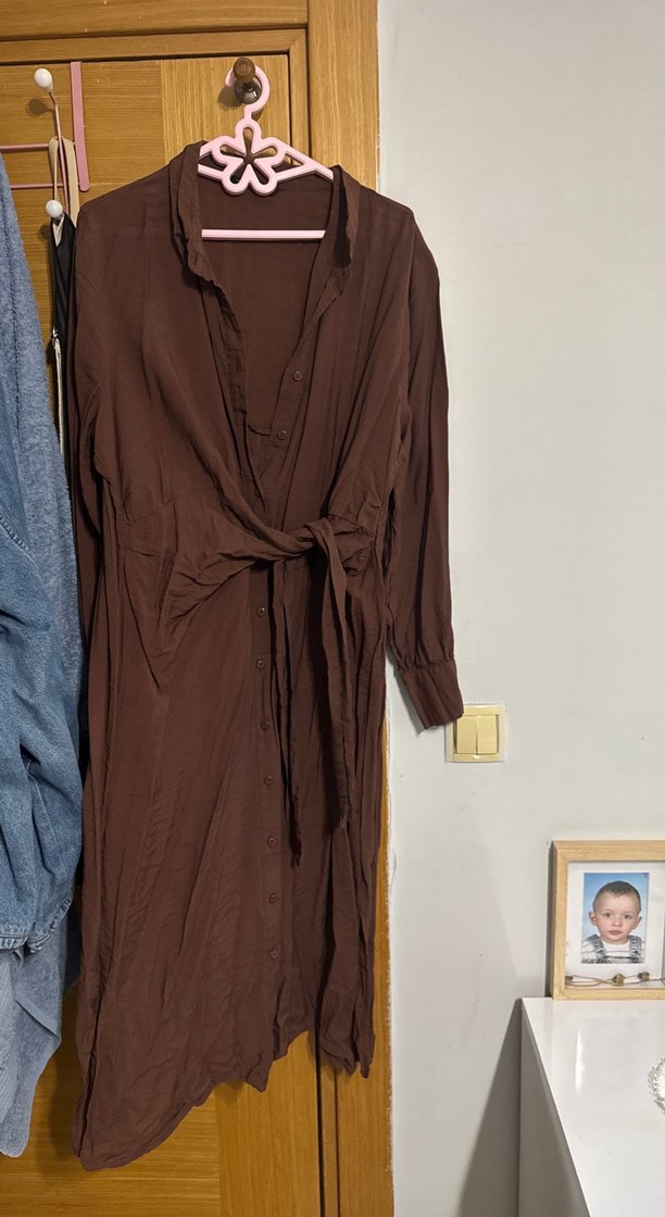 Kahverengi, bol kesim, drapeli, yakalı uzun keten elbise. Uzun kollu, ön düğmeli, günlük rahat kullanım için uygundur.