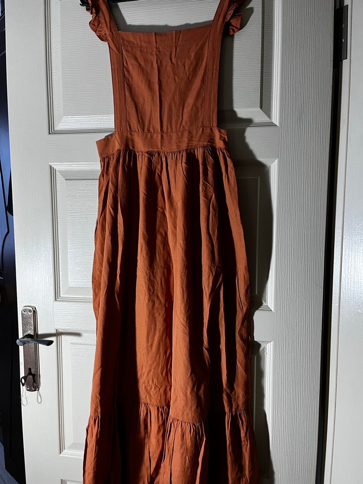 Kadınlar için kahverengi uzun keten elbise, bol kesim ve fırfır detaylara sahiptir. Askılı kollu ve straplez yakalıdır, bohem tarzını yansıtır.