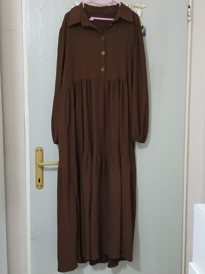 Kahverengi, uzun keten elbise, bol kesimli ve pile detaylıdır. Uzun kollu, yüksek yakalı, minimalist ve normcore tarzda, günlük kullanıma uygundur.