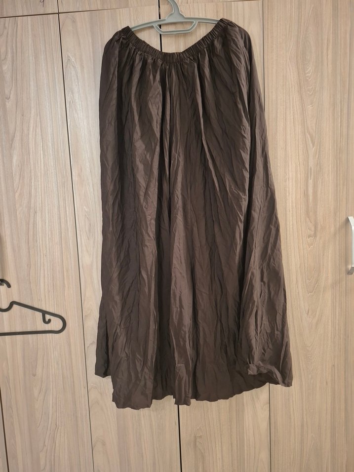 Kadınlar için keten kumaştan, bol kesim ve drapeli tasarıma sahip uzun kahverengi etek. Günlük kullanıma uygun minimalist, bohem tarzda.