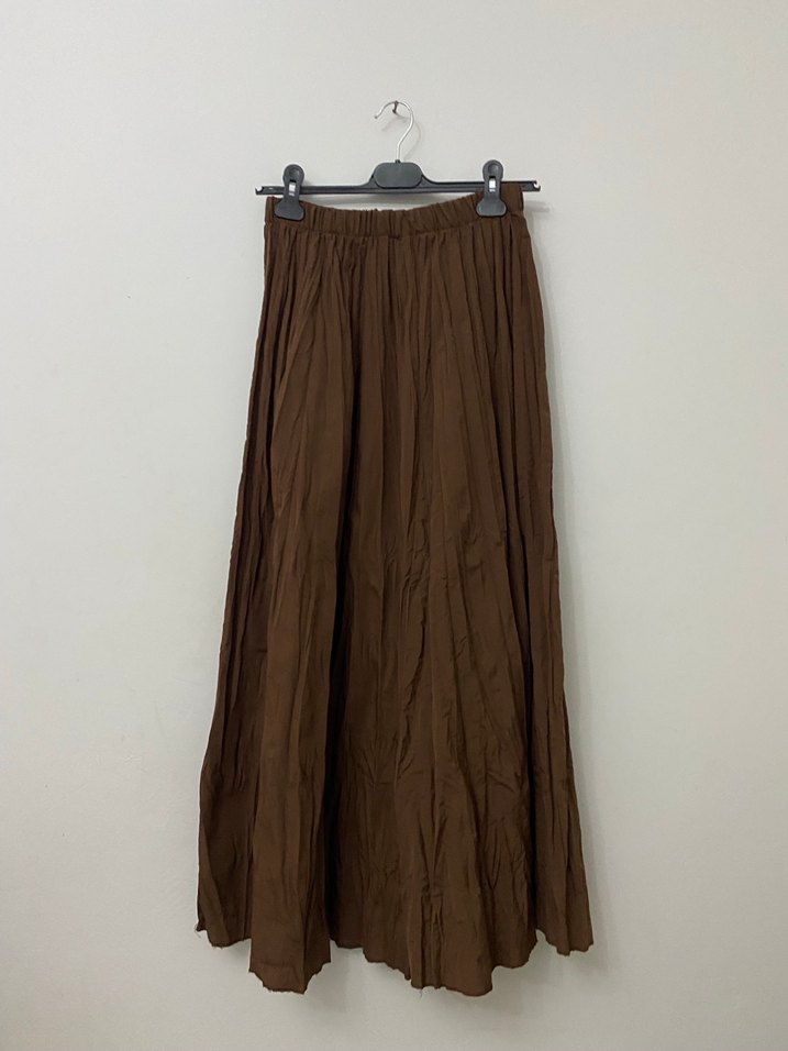 Yumuşak keten kumaştan, kahverengi uzun piliseli ve bol kesim etek. Günlük kullanım için uygun, bohem tarzda.