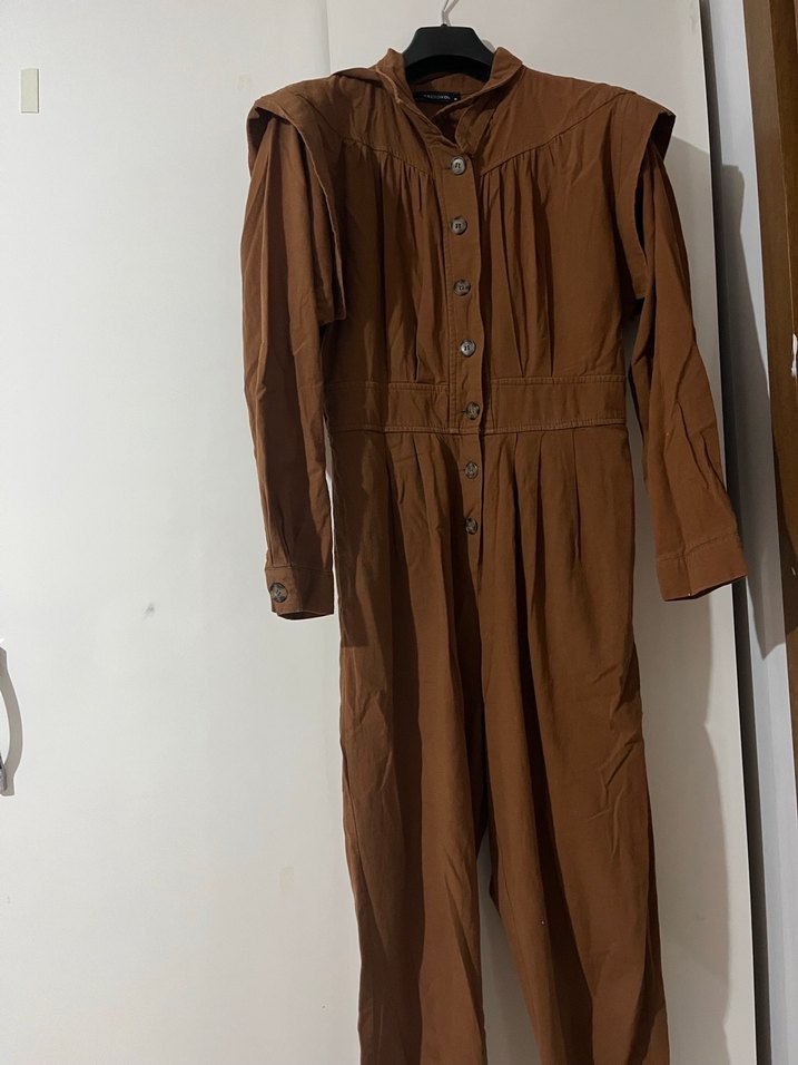 Kadınlar için uzun, bol kesim keten tulum. Uzun kollu, yaka detaylı ve düğmeli ön kısmı vardır. Koyu kahverengi, vintage tarzıyla günlük kullanıma uygundur.