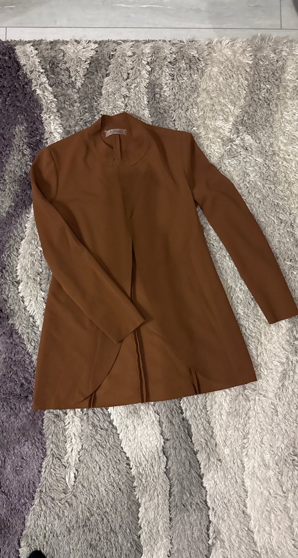 Yurtdışı italyadan Kadınlar için uzun boylu, kahverengi, düz kesim kaban. Uzun kollu ve yakası kesik detaylıdır. Rahat ve modern tarzıyla ofis kullanımı için uygundur. Desensiz, şık ve rahat bir görünüm sunar. İtalyan tg 40 yanı 36 beden