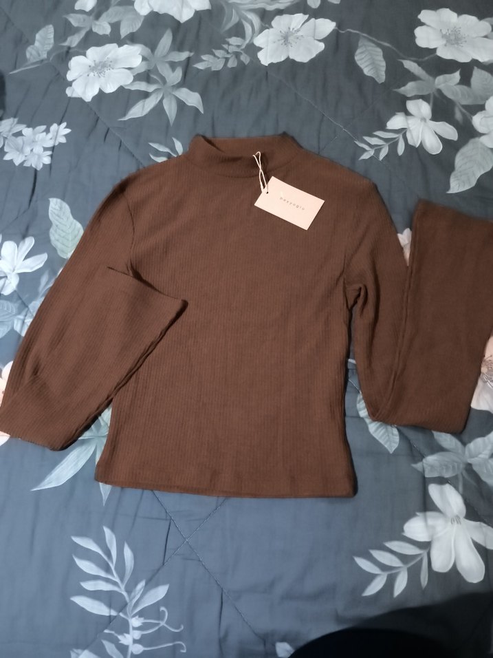Kahverengi, boğazlı, uzun kollu, ince kesim, normal midi boy triko. Yumuşak keten kumaştan, desensiz, gündelik şıklık için uygun.