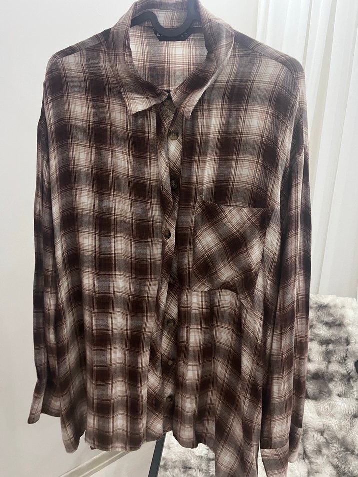 uzun kollu, yakalı ve düğmeli kahverengi gömlek.