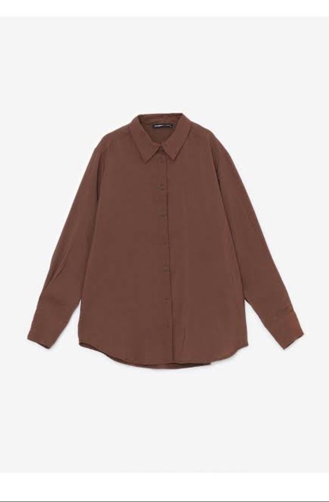 Kadınlar için uzun kollu, yakalı ve bol kesim gömlek. İpeksi kumaştan, koyu bej tonunda, desen içermeyen minimalist tasarım, günlük kullanım için uygun. ✨