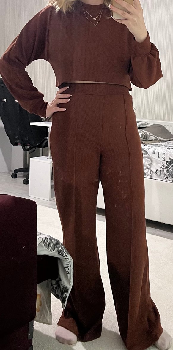 Kadınlar için kahverengi, uzun kollu, yüksek yakalı, ikili takım.
