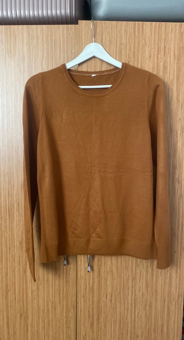 Kadın kahverengi , uzun kollu ve yuvarlak yakalı, bol kesim kazak. Parlak kahverengi rengi ve desensiz, minimalist tasarıma sahip, günlük sokak stili için uygun. ✨