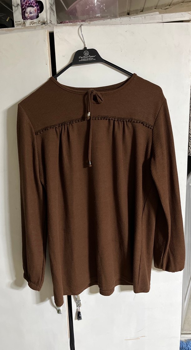 Kahverengi kadın bluz, yuvarlak yaka ve uzun kollu, bol kesimdir. Yumuşak keten kumaştan, pileli ve rahat bohem tarzındadır.