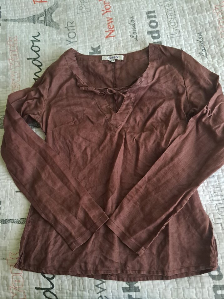 Kahverengi keten bluz, uzun kollu ve bağcıklı V yakalıdır. Rahat kesimi ve bohem tarzıyla günlük kullanıma uygundur.