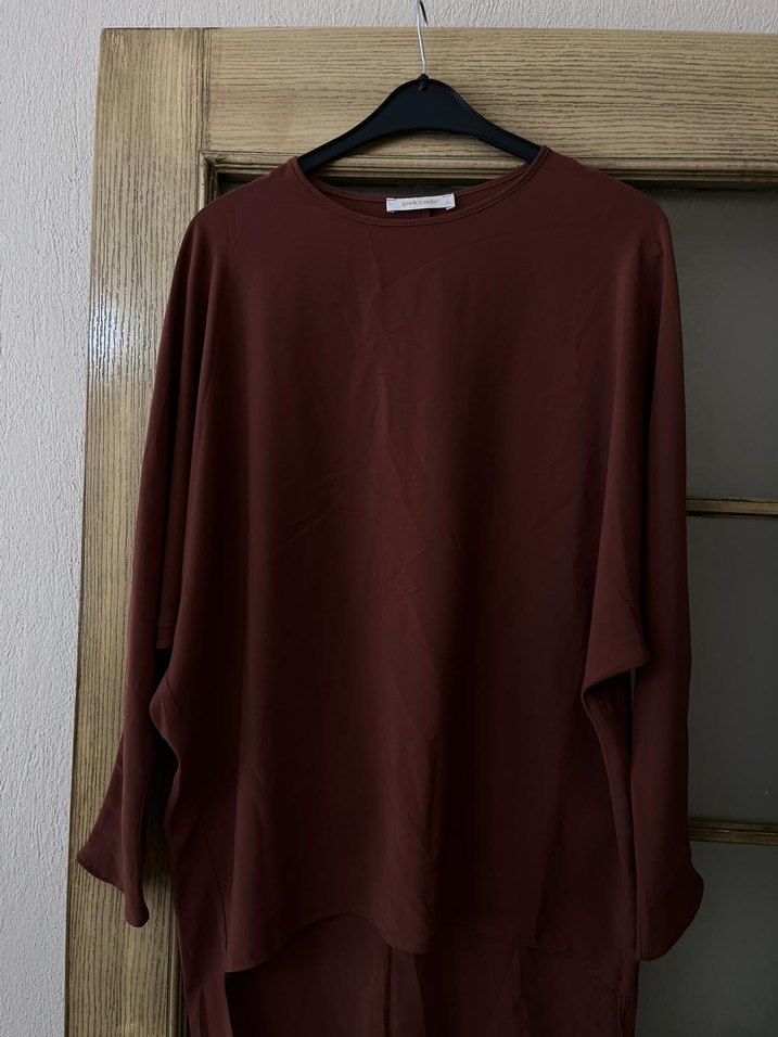 Kadınlar için uzun kollu, yuvarlak yakalı, drapeli tasarıma sahip bol kesim midi tunik. Yumuşak ve ipeksi kumaştan, sade ve minimal kahverengi tonlarında, günlük kullanım için uygundur. Hiç giyilmemiştir. Fiyatlarda yardımcı olurum