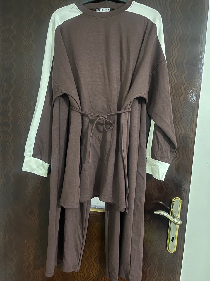 Kahverengi, beyaz çizgili uzun kollu, rahat kesim kadın elbise. Belde bağlama detayı ile ayarlanabilir. Streetwear ve athleisure tarzında.