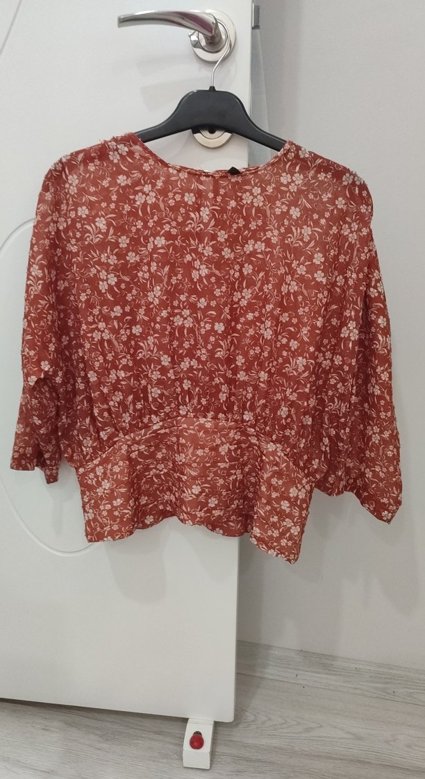 Kadınlar için uzun kollu, salaş kesim, yuvarlak yakalı, açık kahverengi çiçekli desenli bluz. bel kısmı korsajlı, şifon bluz. kiremit rengi