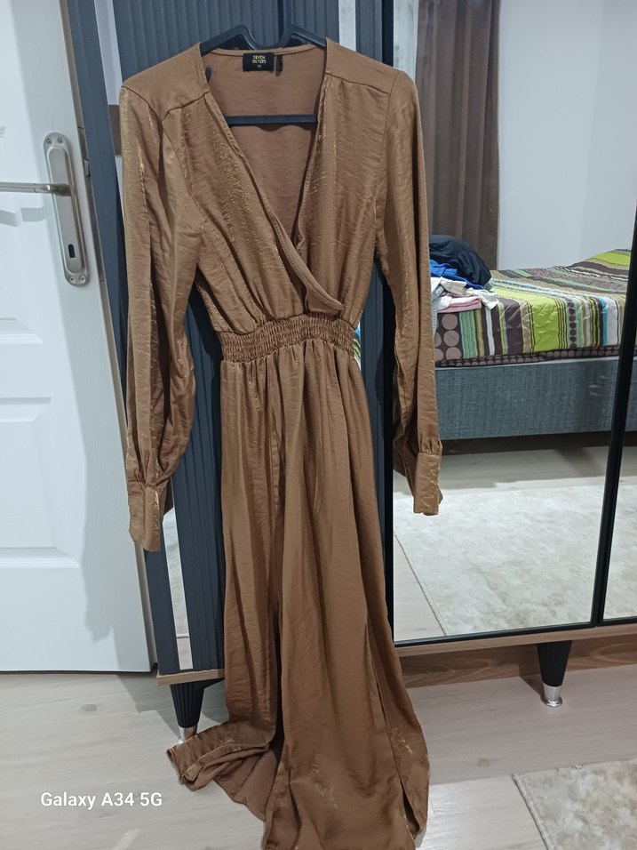 Kahverengi uzun kollu, salaş kesim ve drapeli detaylara sahip elbise. V yaka ve yumuşak sentetik kumaştan, günlük kullanım için uygundur. marka temsilidir. hic kullanilmadi. yikandi dolaba koyuldu