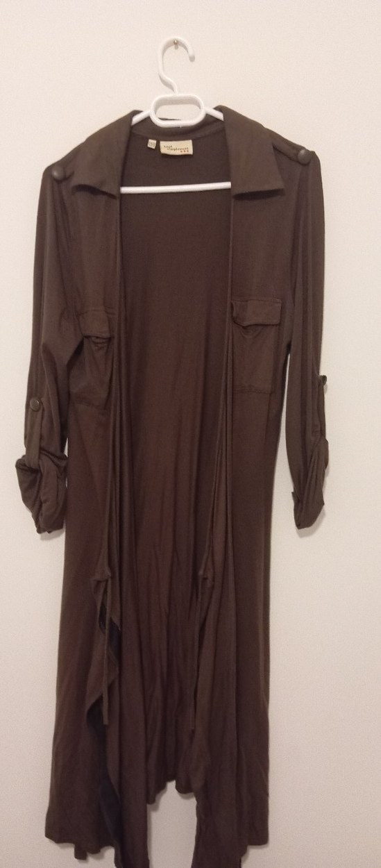Kadınlar için uzun kollu, salaş kesim, koyu kahverengi, desen içermeyen, çağdaş ve günlük stil elbisedir.