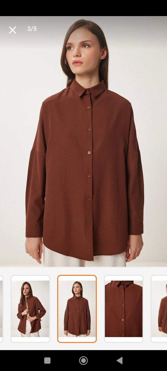 Kadınlar için uzun kollu, bisiklet yaka ve kahverengi salaş kesim gömlek. Düz, midi boy ve sentetik kumaştan, minimalist ve rahat sokak stili sunar.