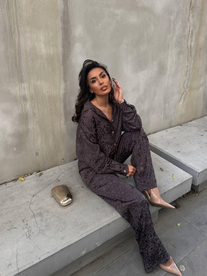 Kahverengi tonlarında, uzun kollu, V yakalı, düğmeli, salaş kesim, uzun boylu, ipeksi dokulu kadın takımı. Günlük kullanım için uygundur.