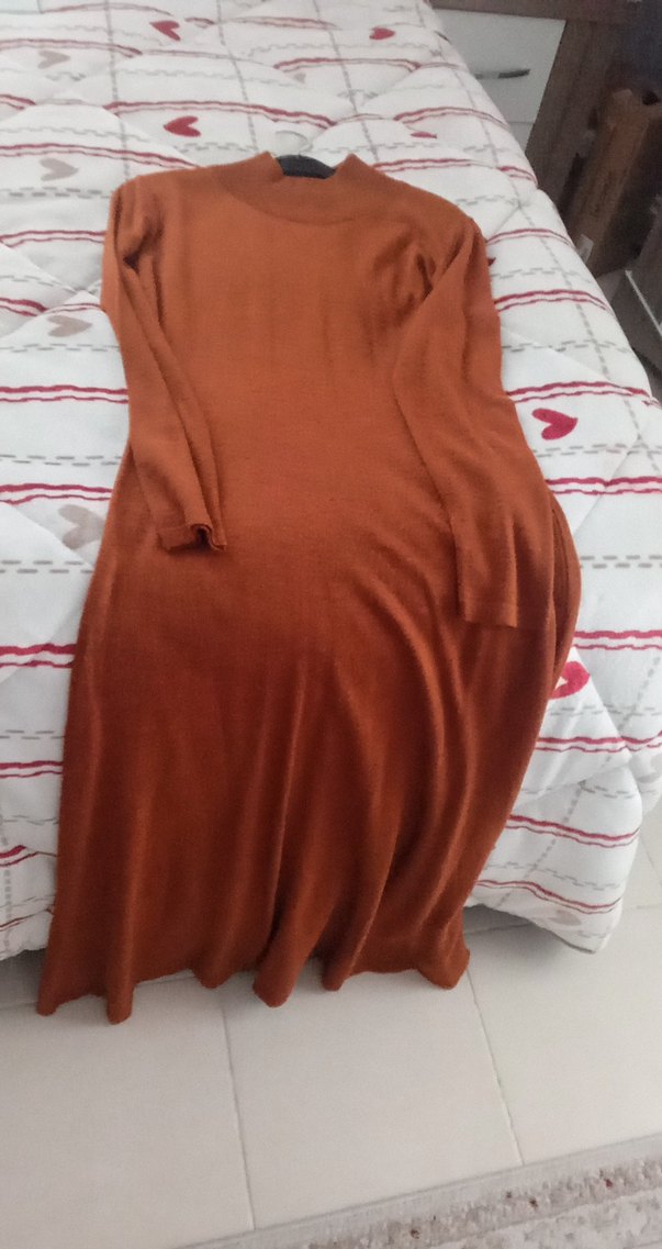 Kadınlar için kahverengi, uzun kollu, salaş kesim ve drapeli uzun elbisedir. Yumuşak sentetik kumaştan yapılmıştır ve günlük kullanıma uygundur. dar kalıp ama esneyen kumaştır