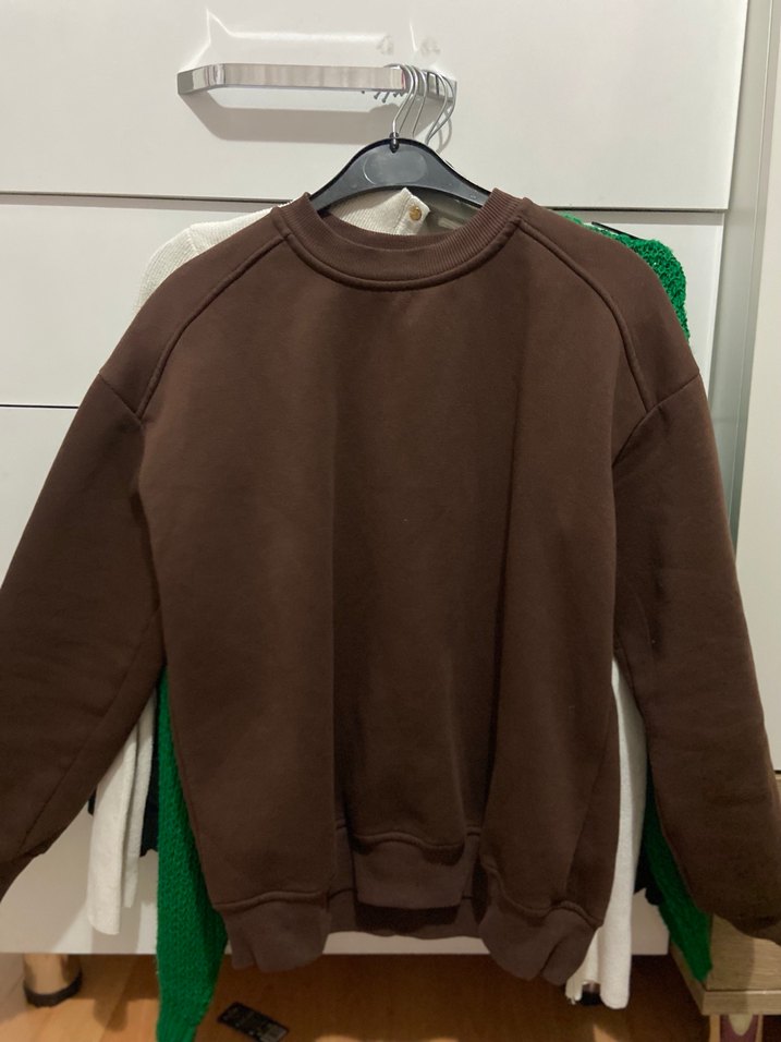 Kahverengi, yuvarlak yakalı ve uzun kollu bu sweatshirt, rahat kesimiyle günlük kullanıma uygun, konforlu ve şık bir sokak stili sunar.