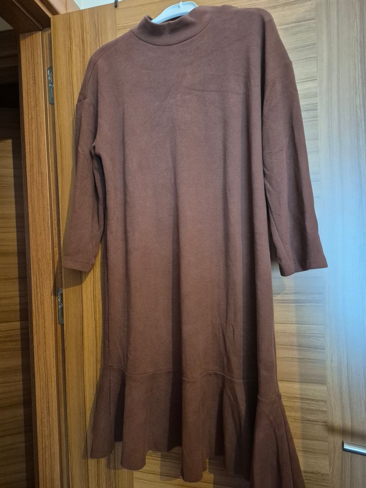 Kadın kahverengi triko elbise, uzun kollu ve salaş kesimdir. Yumuşak keten kumaştan yapılmış, drapeli tasarıma sahiptir, günlük kullanıma uygundur.