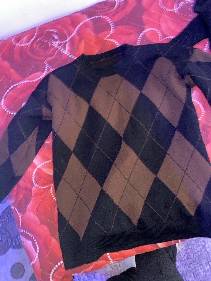 Uzun kollu, yuvarlak yakalı, kahverengi ve siyah baklava desenli kadın triko kazak. Günlük rahatlık için yumuşak sentetik kumaştan yapılmıştır.