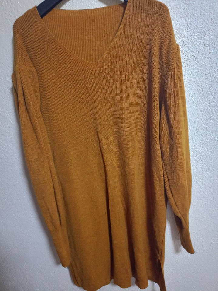 Kadınlar için koyu kahverengi, uzun kollu, gevşek kesim triko elbisedir. Yumuşak dokusu ile rahat bir kullanım sunar. ST beden. Tesettür giyenler için gömlek ve kemerle güzel duruyor