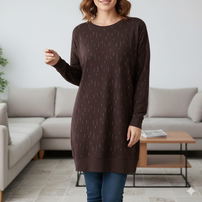 Kadınlar için kahverengi uzun kollu, yuvarlak yakalı, bol kesim midi uzunlukta triko tunik. Sentetik kumaştan örülmüş, rahat ve modern tarzda, günlük kullanıma uygundur.