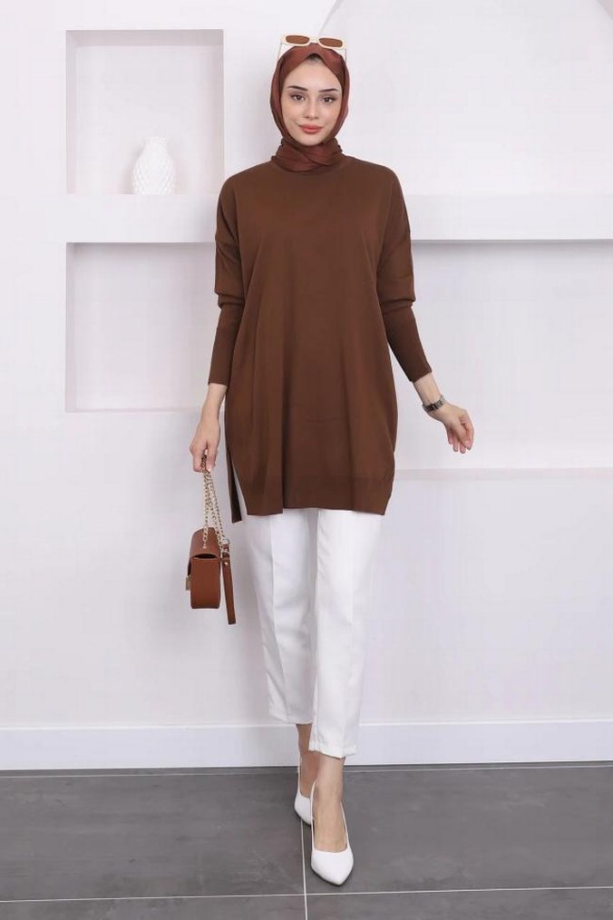 Kadın Kahverengi Uzun Kollu Triko Tunik