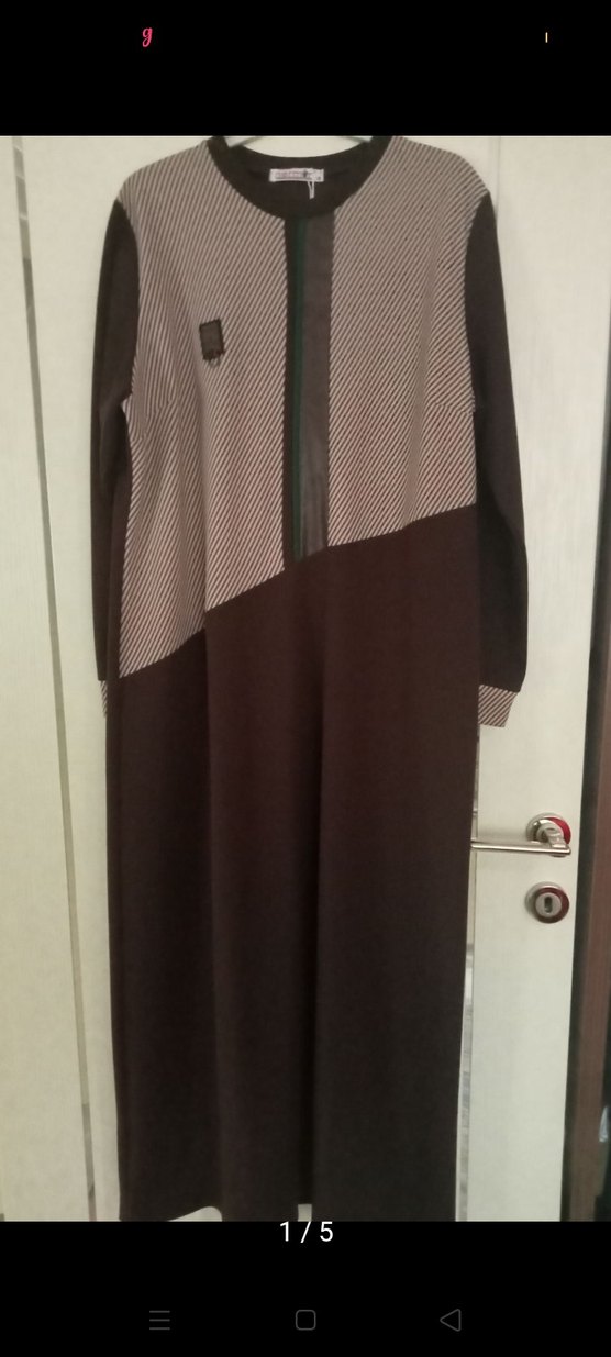 Kadın uzun kollu, yüksek yakalı uzun elbise., kahverengi renkte, fermuarlı detaylı, minimalist ve günlük kullanıma uygun.
