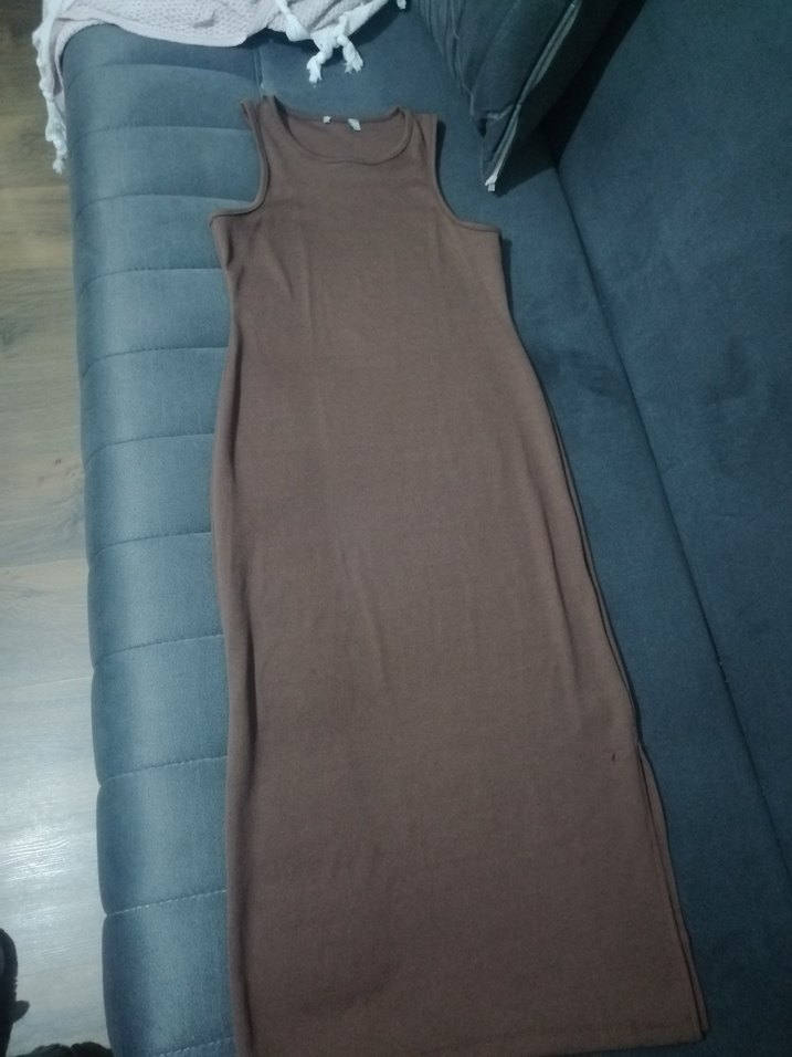 Düz kahverengi, kolsuz uzun elbise, yüksek yakalı ve vücuda oturan kesim, günlük kullanım için yumuşak sentetik kumaştan yapılmıştır. Yandan yırtmacı vardır 1 taraftan