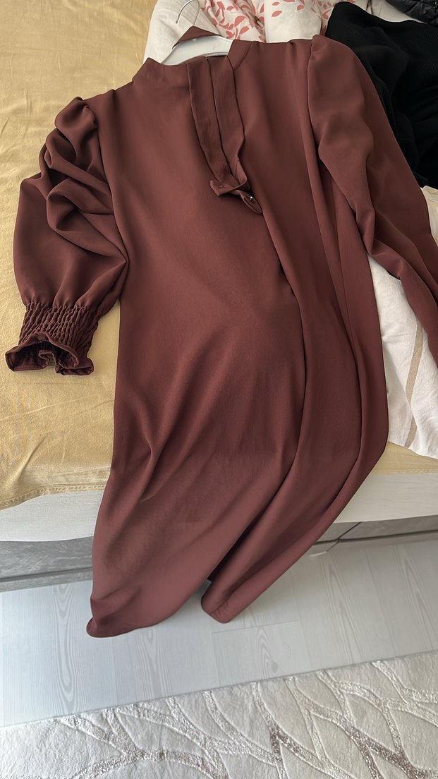 Kadınlar için kahverengi, uzun ve salaş kesim elbise. Yüksek yakalı, uzun kollu ve dökümlü, ipeksi dokuda rahat bir tasarım sunar.