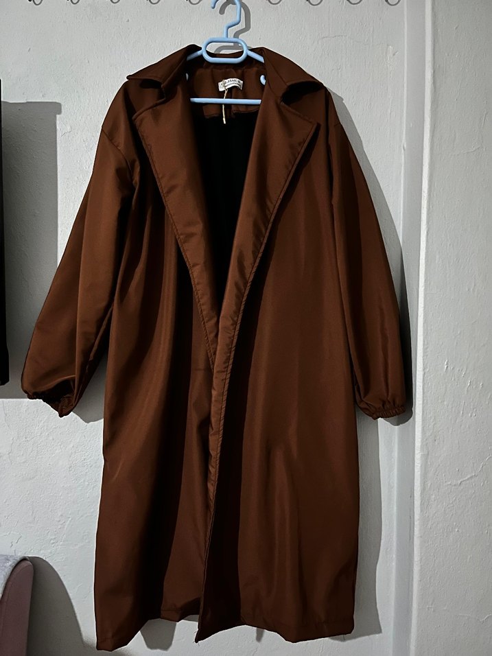 Kadınlar için koyu kahverengi, uzun, salaş kesimli, drapeli ve ipeksi dokulu trençkot. Uzun kollu ve yakası açık, minimalist ve sade tasarıma sahip. Günlük sokak stili için uygun, desensiz model.