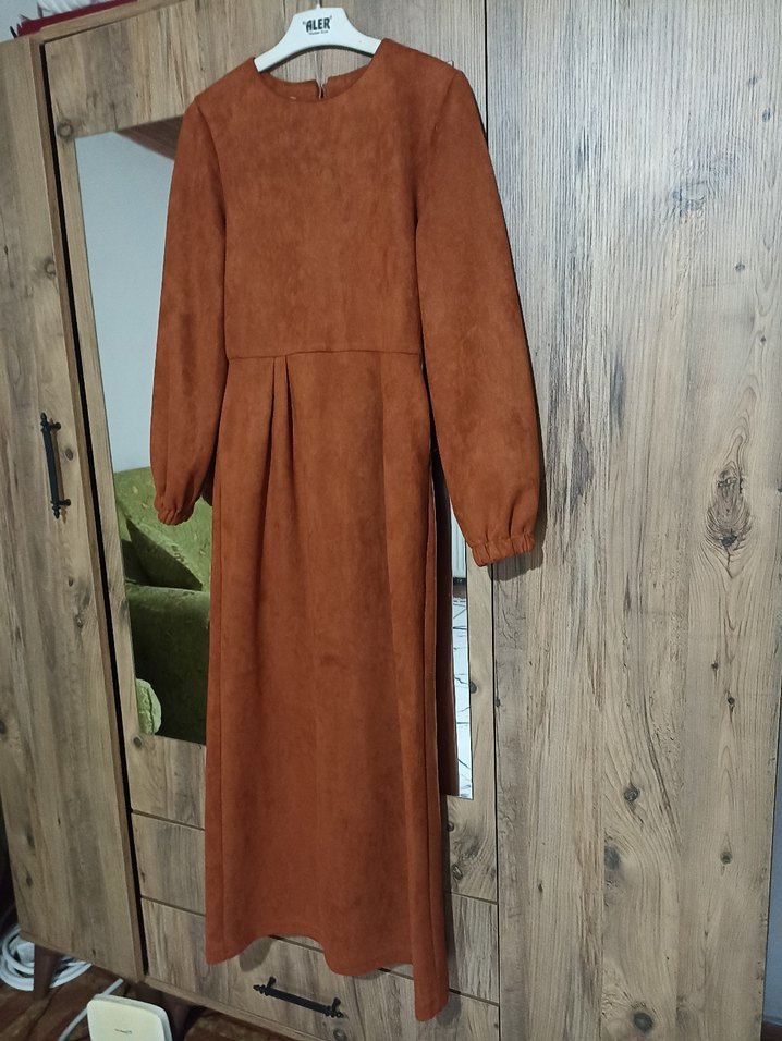Kadın kahverengi uzun süet elbise, drapeli tasarım, uzun kollu ve yuvarlak yaka. Günlük kullanıma uygun, rahat ve bohem tarzda, modest kesim.