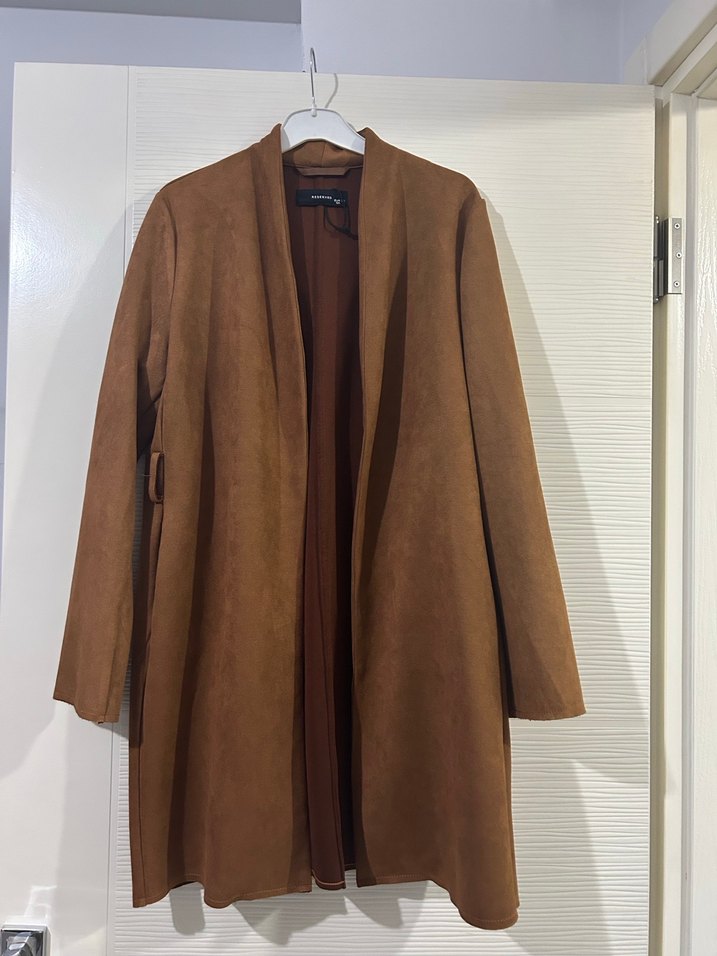 Kadınlar için uzun boy, düzenli kesim ve yumuşak süet malzemeden yapılmış kahverengi kaban. Açık yaka ve uzun kollu, desen içermeyen minimalist tasarım ofis için uygundur.