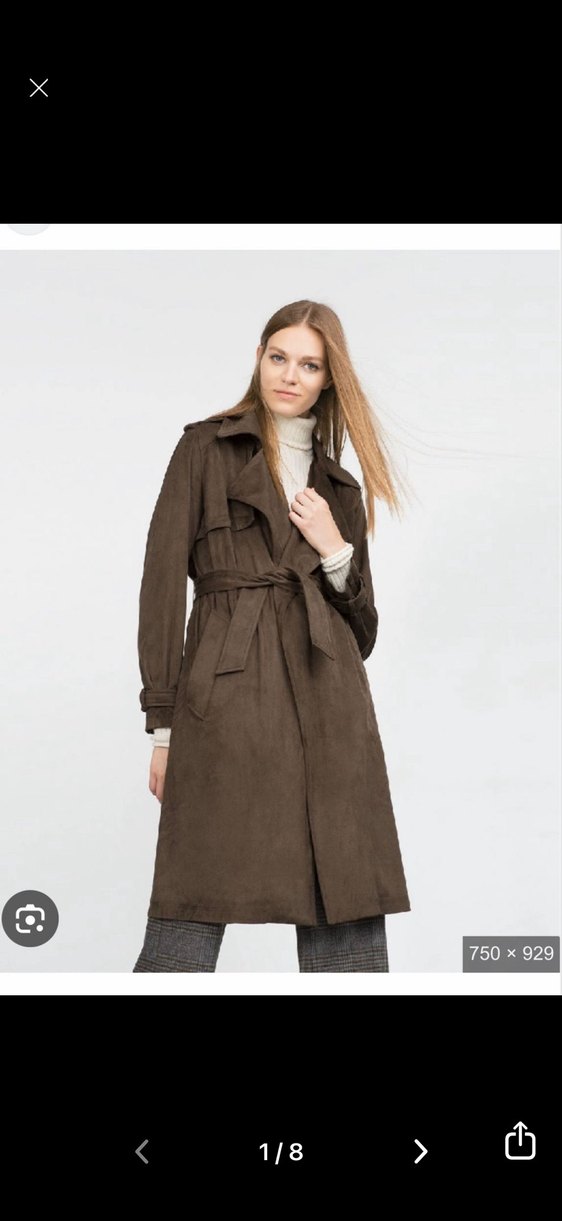 Uzun kahverengi süet trençkot, kuşaklı ve kesik yakalıdır. Bol kesim ve uzun kolludur, gündelik sokak tarzı için uygundur.