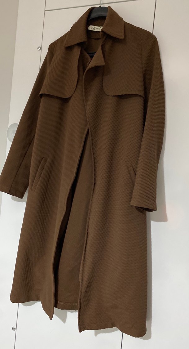 Kadın kahverengi uzun trench coat, bol kesim ve drapeli tasarıma sahip. Yumuşak ve sıcak kumaştan üretilmiş, uzun kollu ve günlük kullanım için uygun.