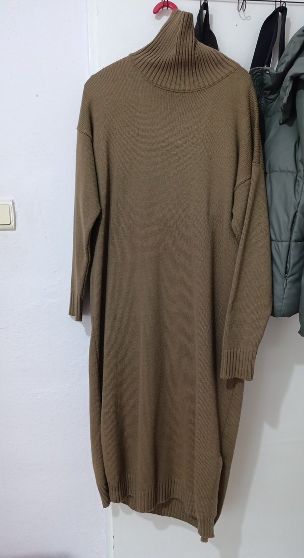 Kadınlar için uzun, bol kesim, boğazlı kahverengi triko kazak. Örgü kumaştan, uzun kollu ve desensizdir. Rahat günlük kullanım için uygundur.