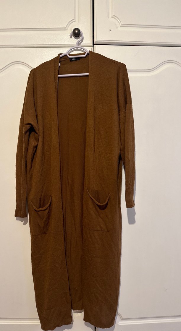 Kadınlar için uzun, bol kesim, süet görünümlü triko hırka. Uzun kollu, yakası kesik ve önünde iki cep bulunur. Günlük sokak stili için kahverengi, rahat bir parça.