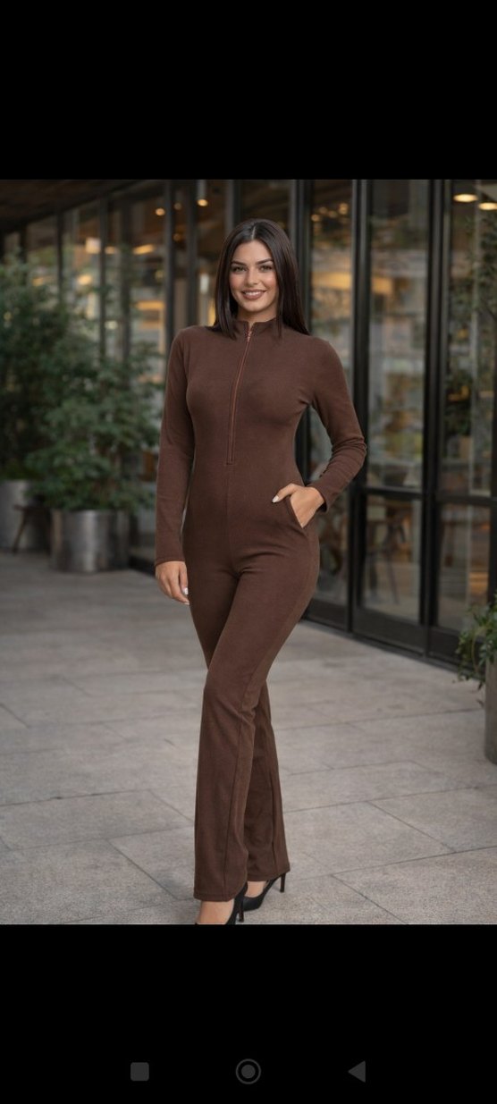 Kahverengi tulum, yüksek yaka ve uzun kollu, rahat ve şık sokak stili sunar. Normal kesim ve uzun boylu, günlük kullanım için uygun.cepsiz modeli