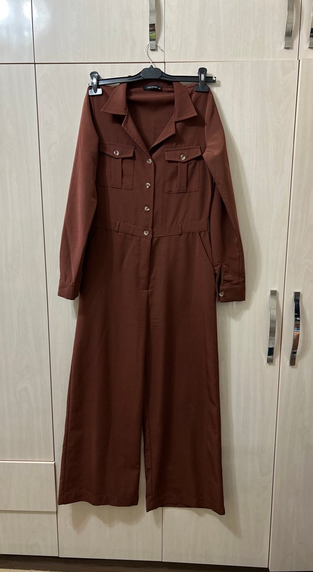 Kadın kahverengi uzun tulum, çıtçıtlı önü, çıtçıtlı iki cep ve notlu yakaya sahiptir. Uzun kollu, regular fit, sentetik kumaştan günlük rahat kullanım için uygundur.