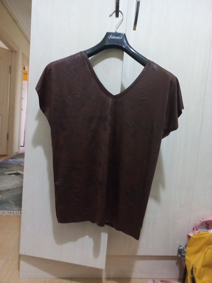 Kadınlar için V yaka ve kısa kollu, yumuşak süet kumaştan yapılmış koyu kahverengi batik desenli bluz. Rahat kesimli ve normal boyda, gündelik sokak stiline uygun şık bir parça. mağazada kalan ürünlerden the secret marka xl beden iki kol arasi 55 cm boyu 60 cm hiç kullanılmadı