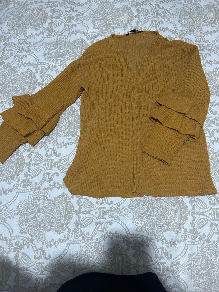 Kahverengi örgü hırka, uzun kollu ve kat kat fırfırlı detaylara sahip. V yakalı, bol kesim ve midi boydadır. Trendy günlük stil için uygundur.
