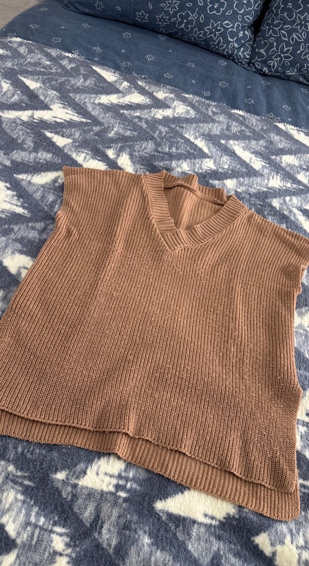 Kahverengi, V yaka, kolsuz örgü süveter. Rahat kesimi ve midi uzunluğuyla günlük sokak stiline uygundur.